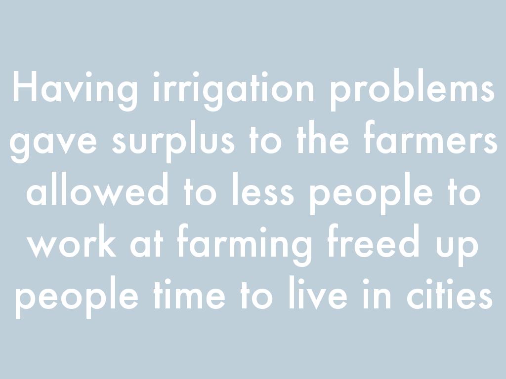 Having irrigation problems gave surplus to the farmers allowed to less people to work at farming freed up people time to live in cities