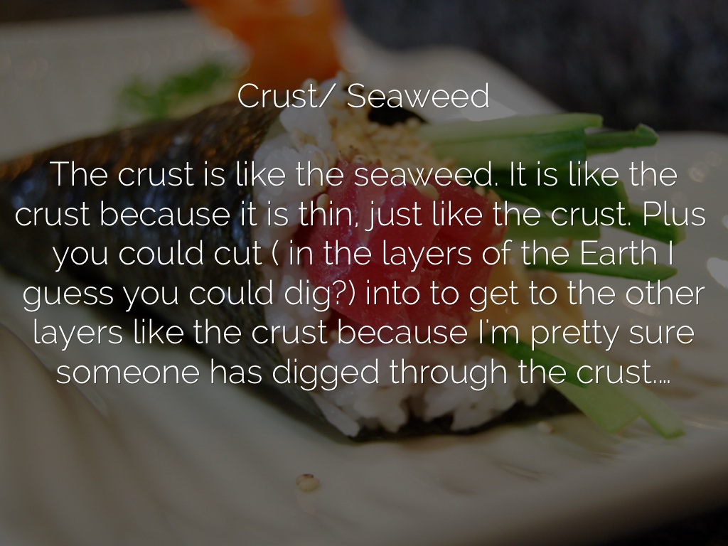 The crust is like the seaweed. It is like the crust because it is thin, just like the crust. Plus you could cut ( in the layers of the Earth I guess you could dig?) into to get to the other layers like the crust because I'm pretty sure someone has digged through the crust.