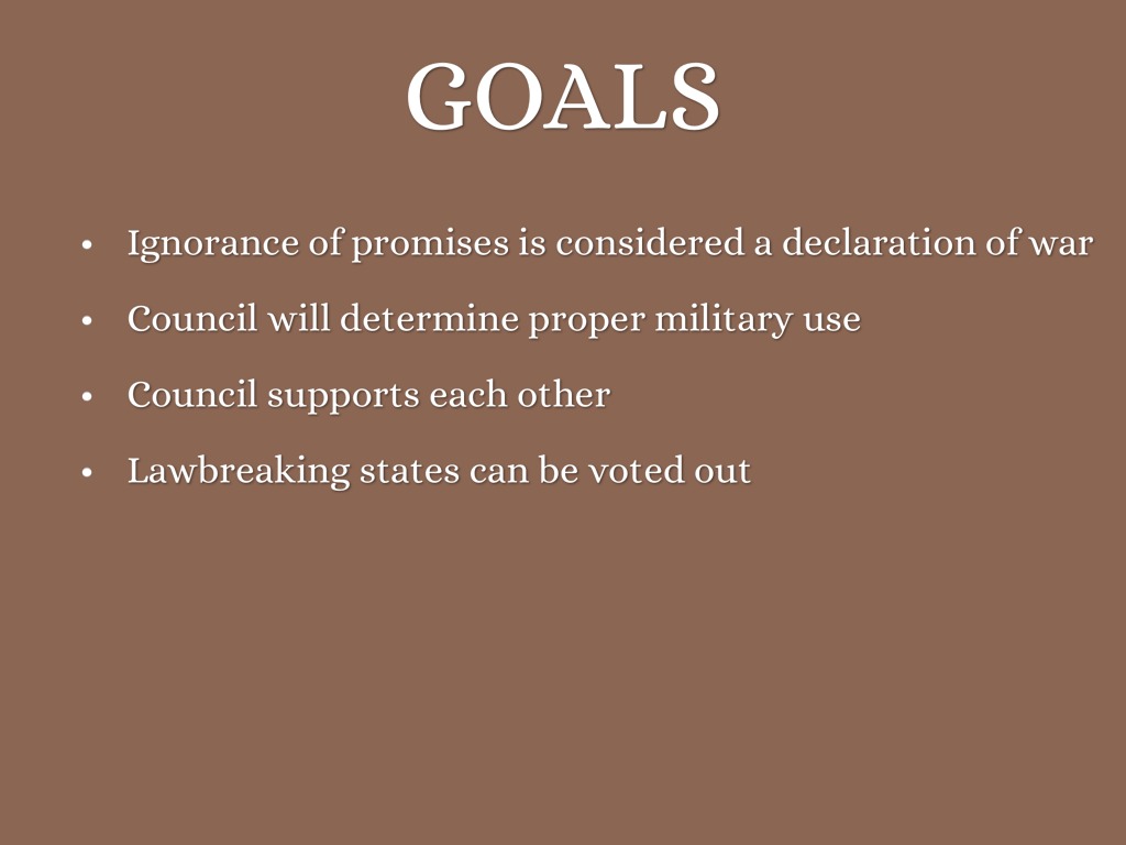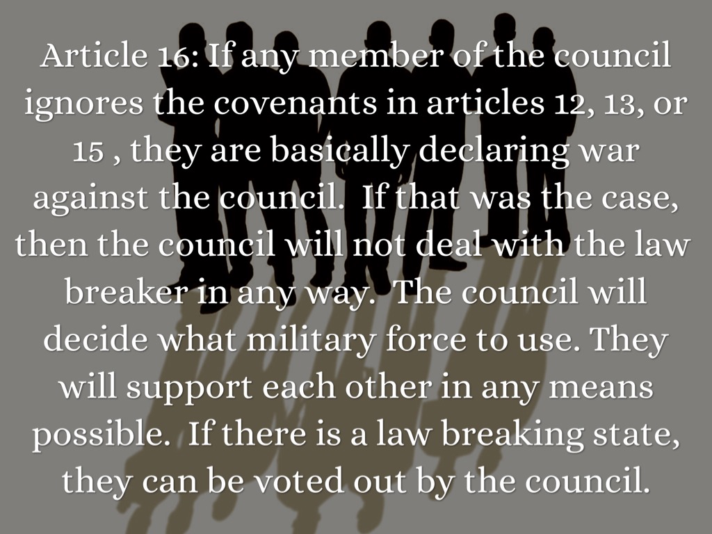 Article 16: If any member of the council ignores the covenants in articles 12, 13, or 15 , they are basically declaring war against the council. If that was the case, then the council will not deal with the law breaker in any way. The council will decide what military force to use. They will support each other in any means possible. If there is a law breaking state, they can be voted out by the council.