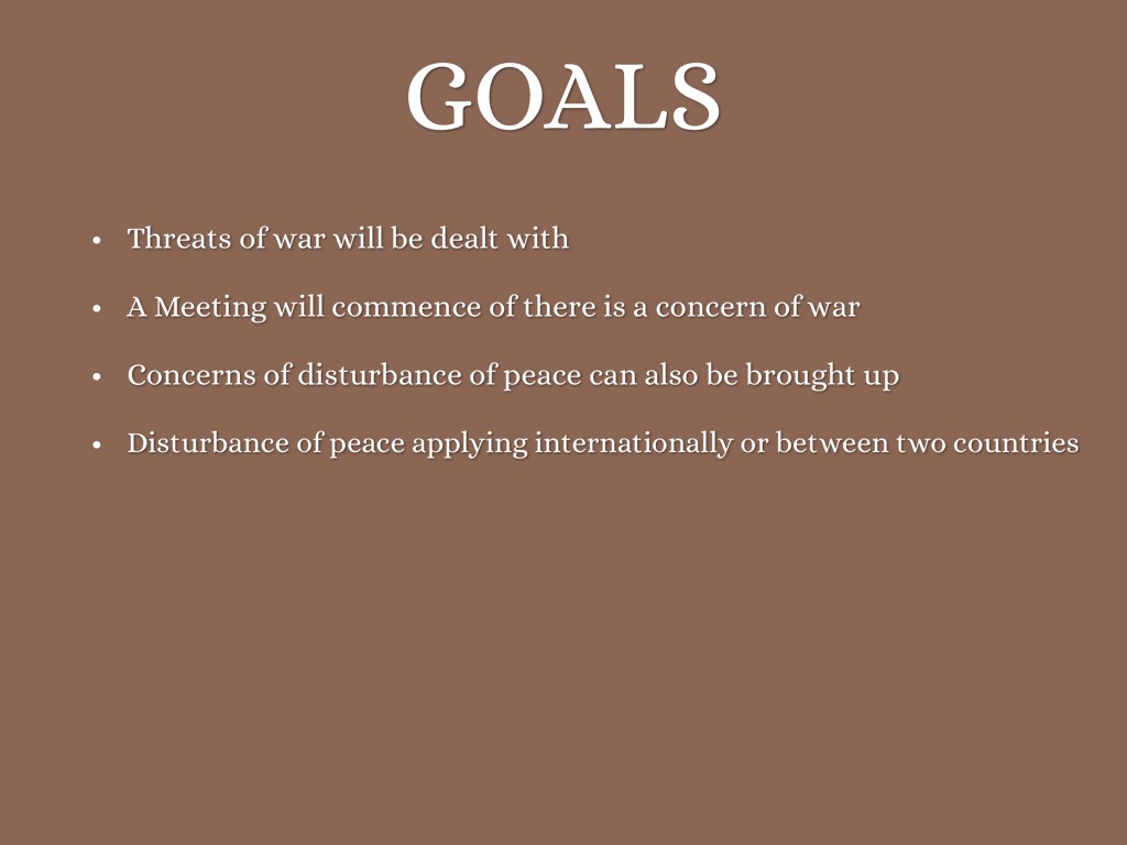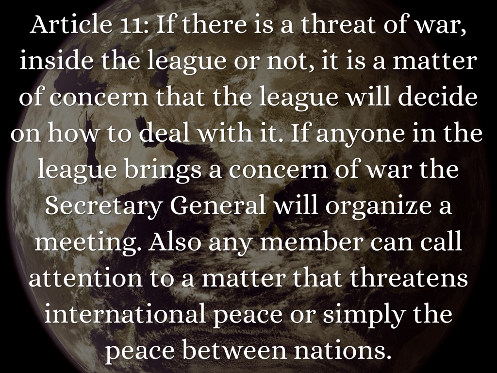 Article 11: If there is a threat of war, inside the league or not, it is a matter of concern that the league will decide on how to deal with it. If anyone in the league brings a concern of war the Secretary General will organize a meeting. Also any member can call attention to a matter that threatens international peace or simply the peace between nations.