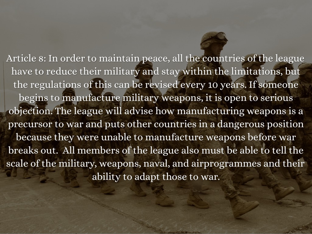 Article 8: In order to maintain peace, all the countries of the league have to reduce their military and stay within the limitations, but the regulations of this can be revised every 10 years. If someone begins to manufacture military weapons, it is open to serious objection. The league will advise how manufacturing weapons is a precursor to war and puts other countries in a dangerous position because they were unable to manufacture weapons before war breaks out. All members of the league also must be able to tell the scale of the military, weapons, naval, and airprogrammes and their ability to adapt those to war.