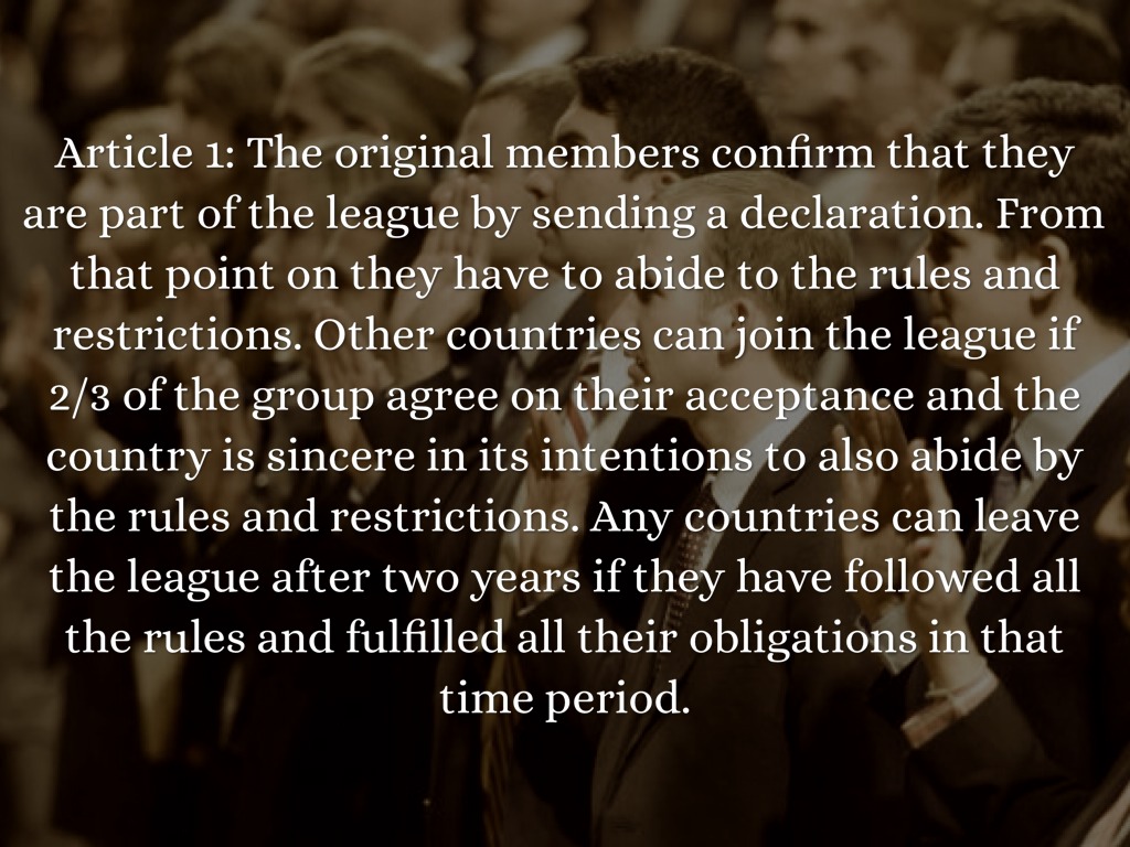 Article 1: The original members confirm that they are part of the league by sending a declaration. From that point on they have to abide to the rules and restrictions. Other countries can join the league if 2/3 of the group agree on their acceptance and the country is sincere in its intentions to also abide by the rules and restrictions. Any countries can leave the league after two years if they have followed all the rules and fulfilled all their obligations in that time period.