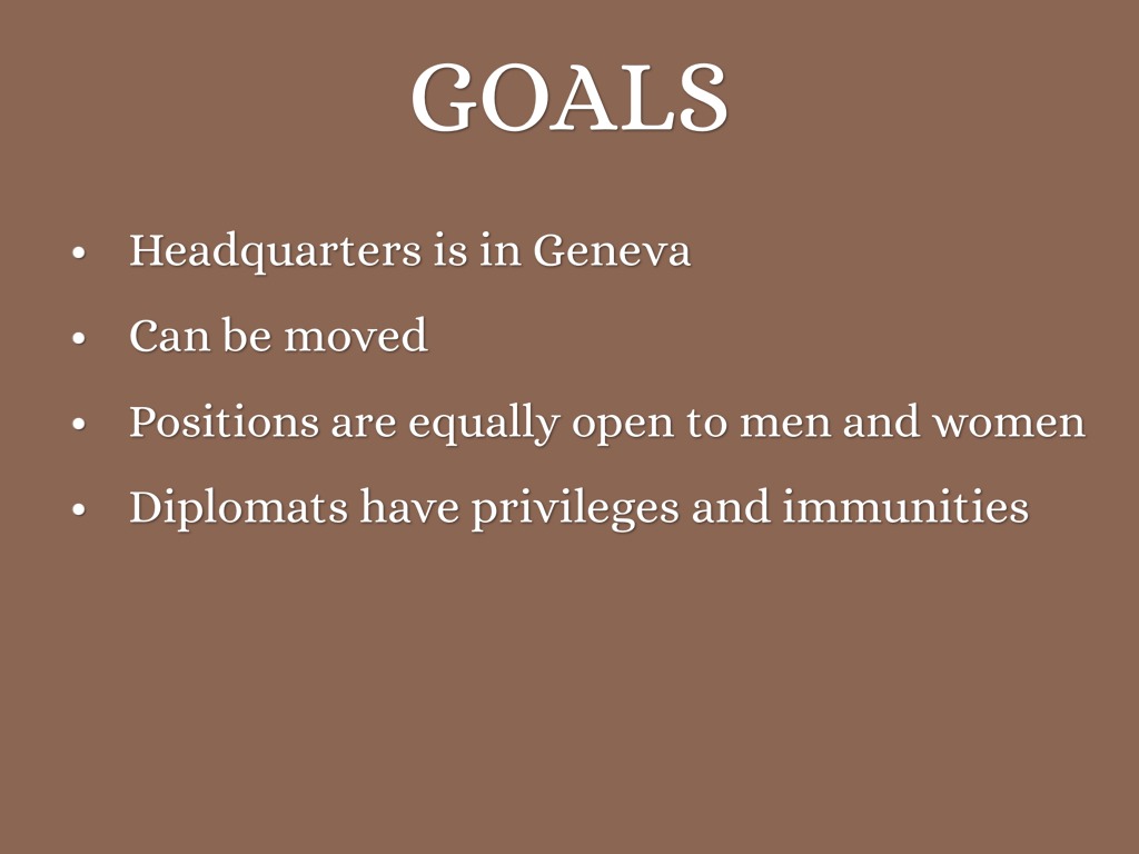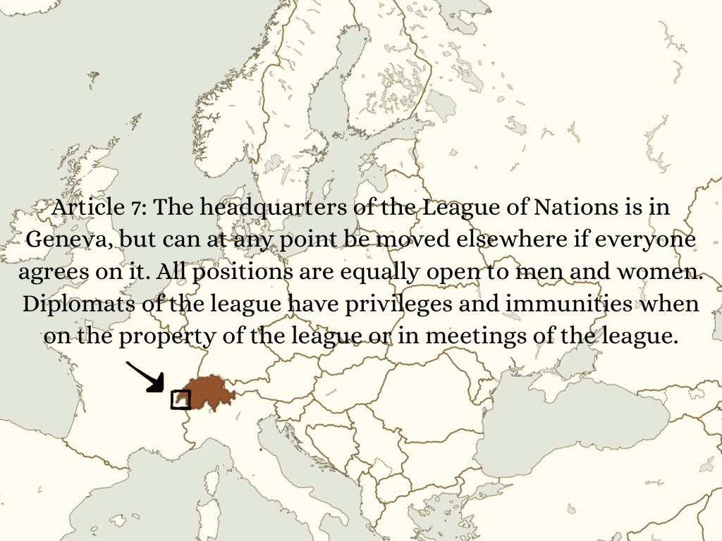Article 7: The headquarters of the League of Nations is in Geneva, but can at any point be moved elsewhere if everyone agrees on it. All positions are equally open to men and women. Diplomats of the league have privileges and immunities when on the property of the league or in meetings of the league.