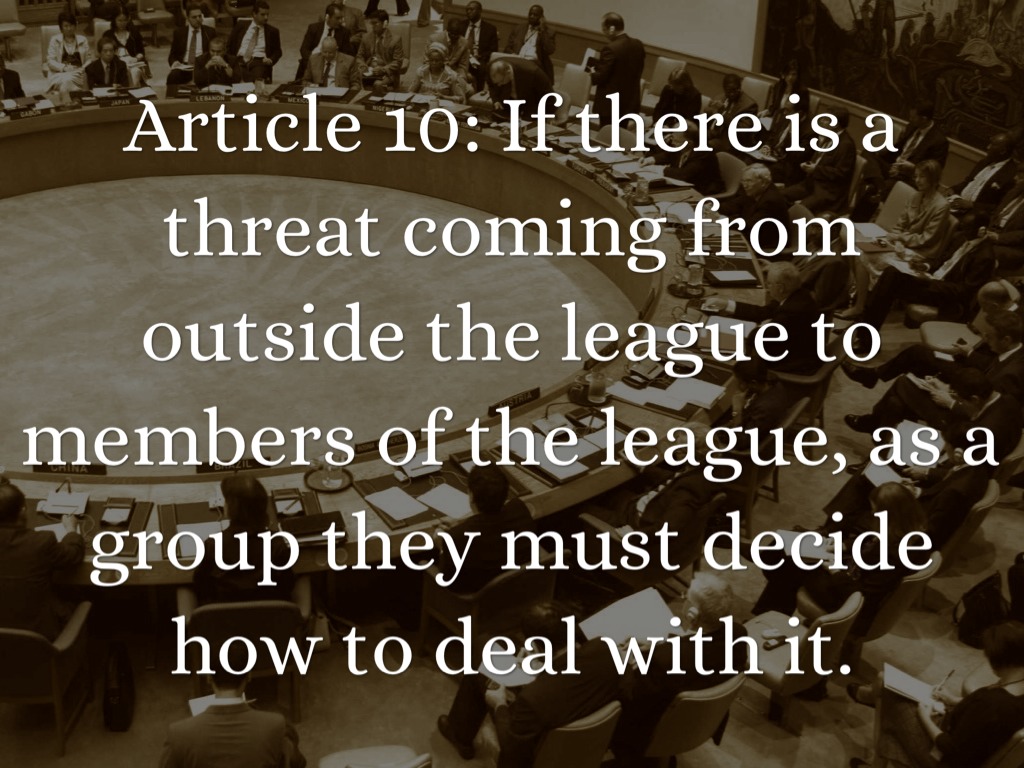 Article 10: If there is a threat coming from outside the league to members of the league, as a group they must decide how to deal with it.