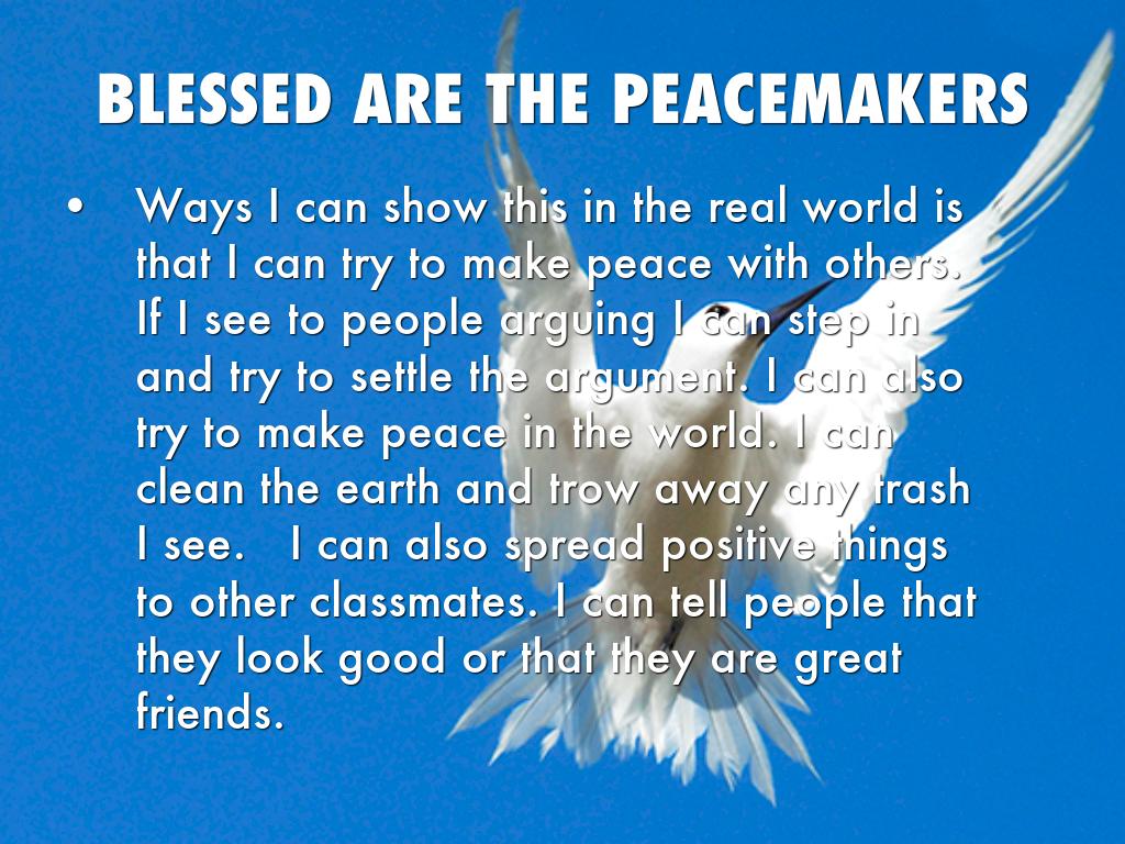 Ways I can show this in the real world is that I can try to make peace with others. If I see to people arguing I can step in and try to settle the argument. I can also try to make peace in the world. I can clean the earth and trow away any trash I see. I can also spread positive things to other classmates. I can tell people that they look good or that they are great friends.