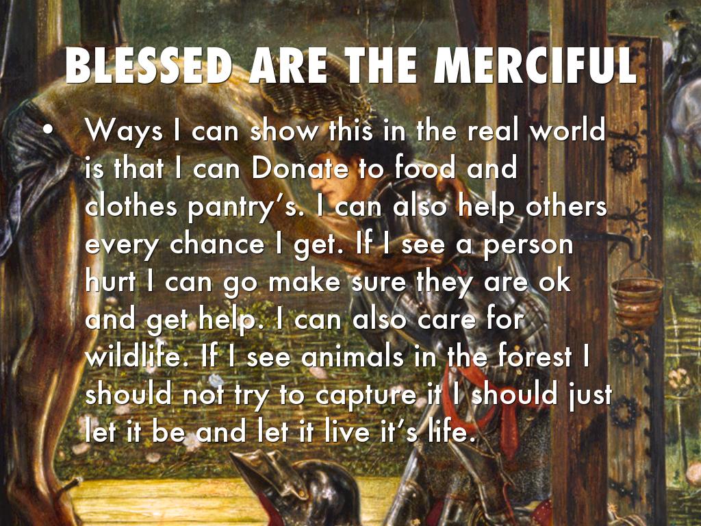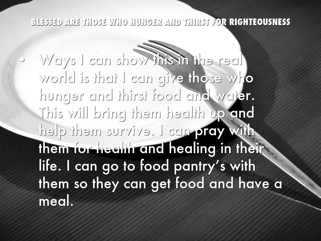 Ways I can show this in the real world is that I can give those who hunger and thirst food and water. This will bring them health up and help them survive. I can pray with them for health and healing in their life. I can go to food pantry’s with them so they can get food and have a meal.
