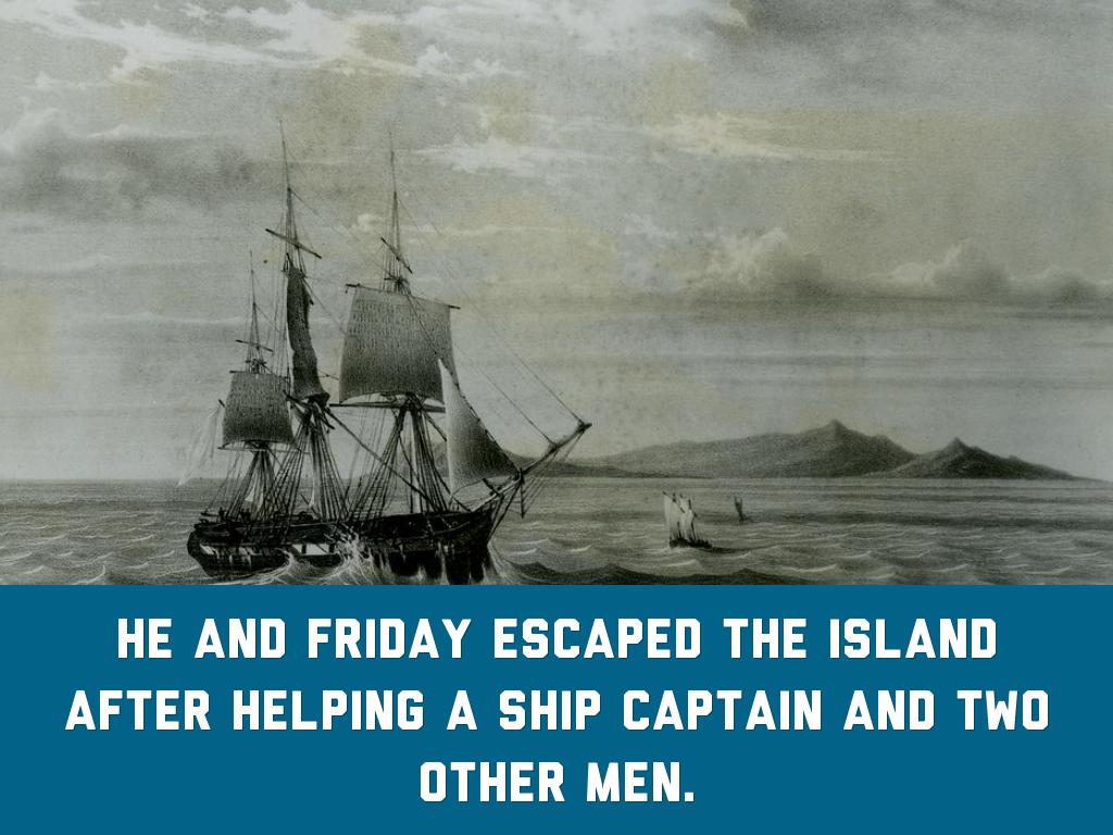 He and friday escaped the island after helping a ship captain and two other men.