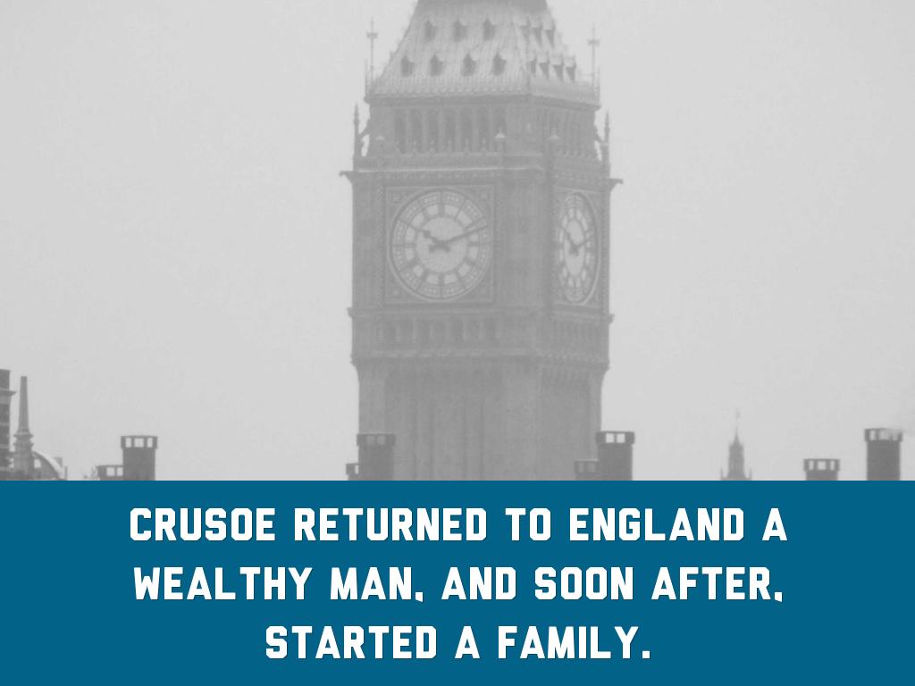 Crusoe returned to england a wealthy man, and soon after, started a family.