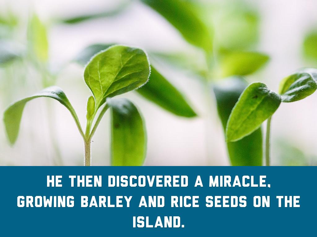 He then discovered a miracle, growing barley and rice seeds on the island.