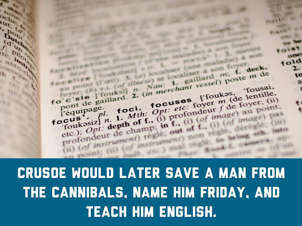 Crusoe would later save a man from the cannibals, name him friday, and teach him english.