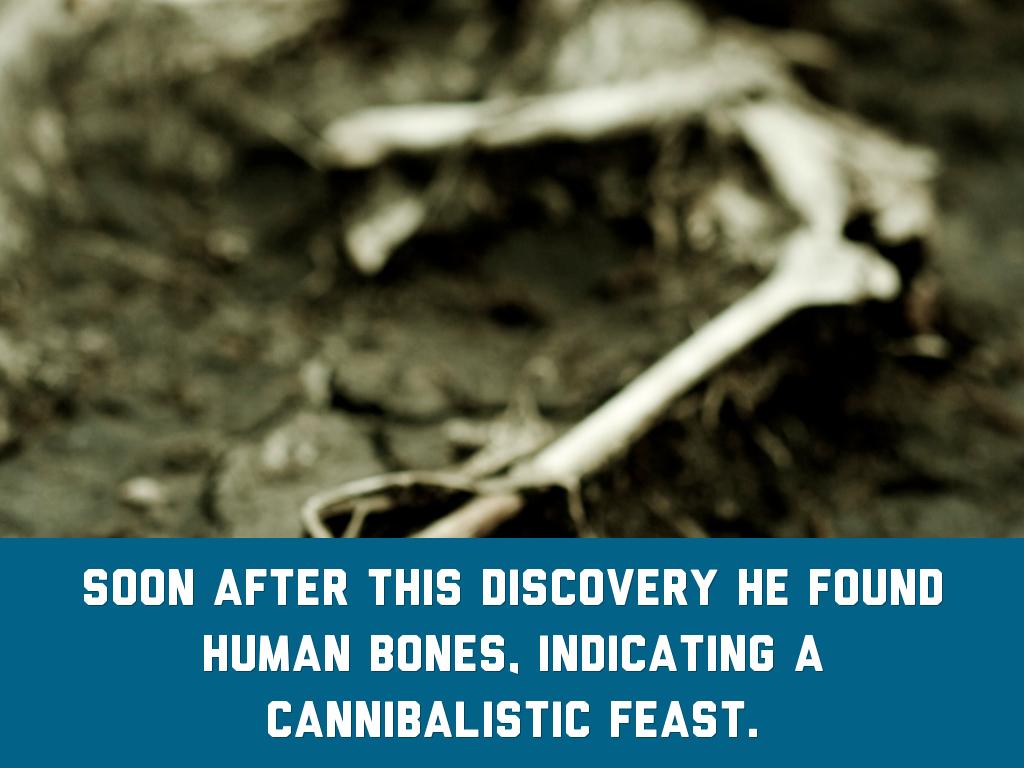 Soon after this discovery he found human bones, indicating a cannibalistic feast.