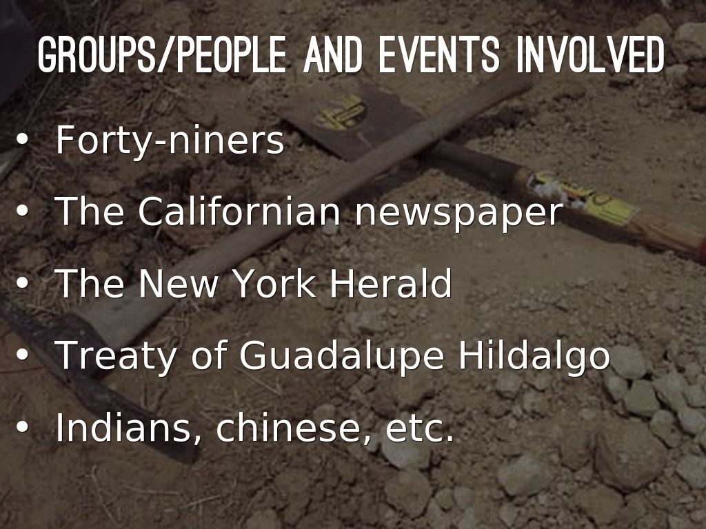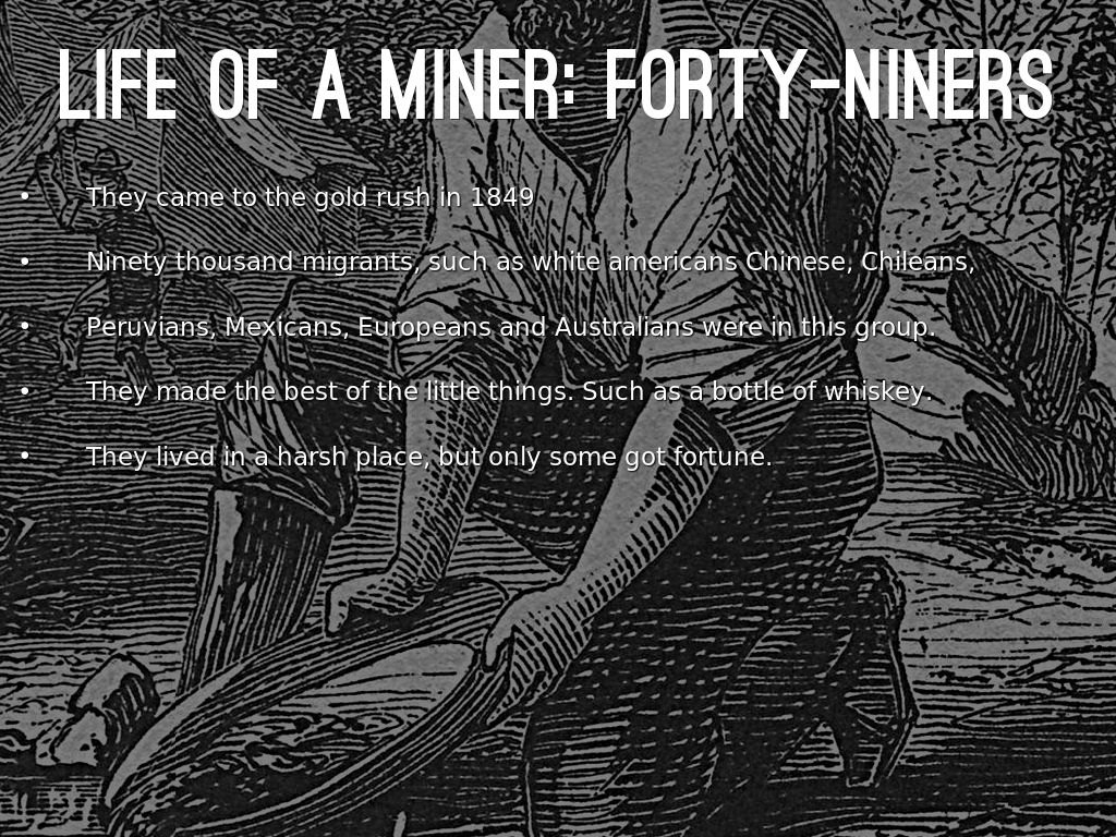Thats when Ninety thousand migrants, or the Forty-Niners headed to CA.