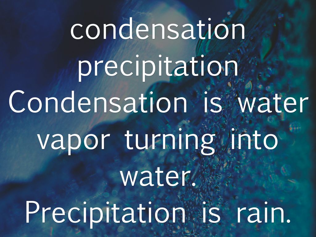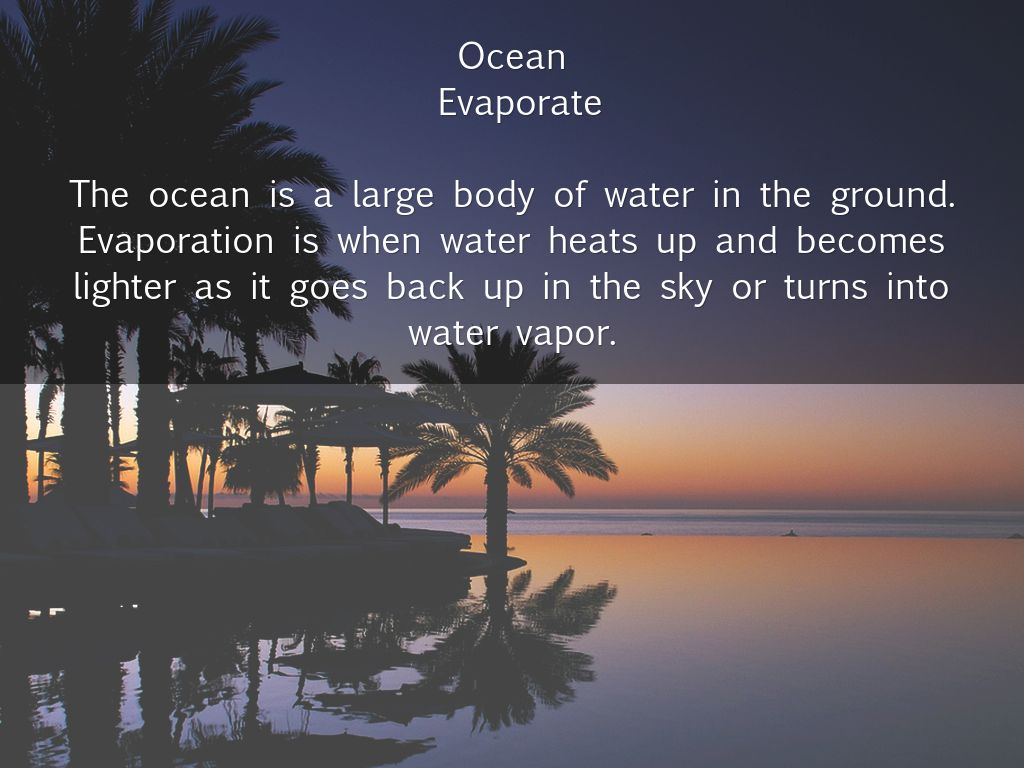 The ocean is a large body of water in the ground. Evaporation is when water heats up and becomes lighter as it goes back up in the sky or turns into water vapor.