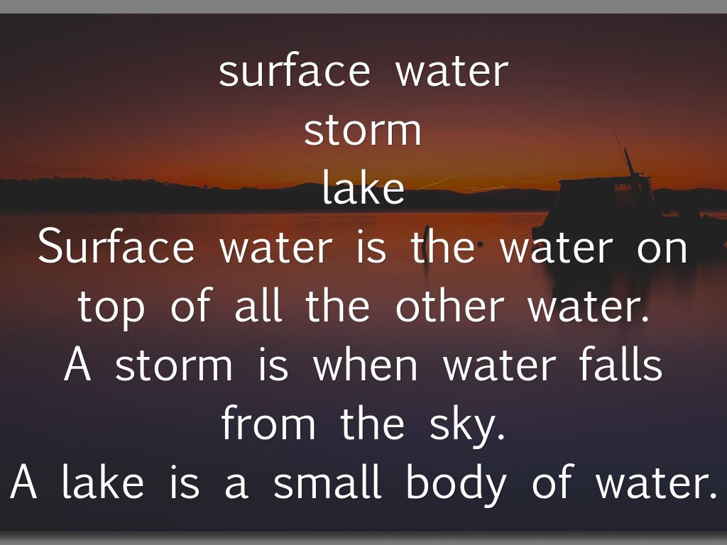 surface water storm lake Surface water is the water on top of all the other water. A storm is when water falls from the sky. A lake is a small body of water.