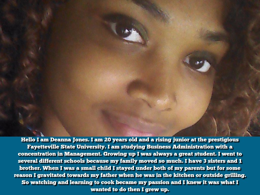 Hello I am Deanna Jones. I am 20 years old and a rising junior at the prestigious Fayetteville State University. I am studying Business Administration with a concentration in Management. Growing up I was always a great student. I went to several different schools because my family moved so much. I have 3 sisters and 1 brother. When I was a small child I stayed under both of my parents but for some reason I gravitated towards my father when he was in the kitchen or outside grilling. So watching and learning to cook became my passion and I knew it was what I wanted to do then I grew up.