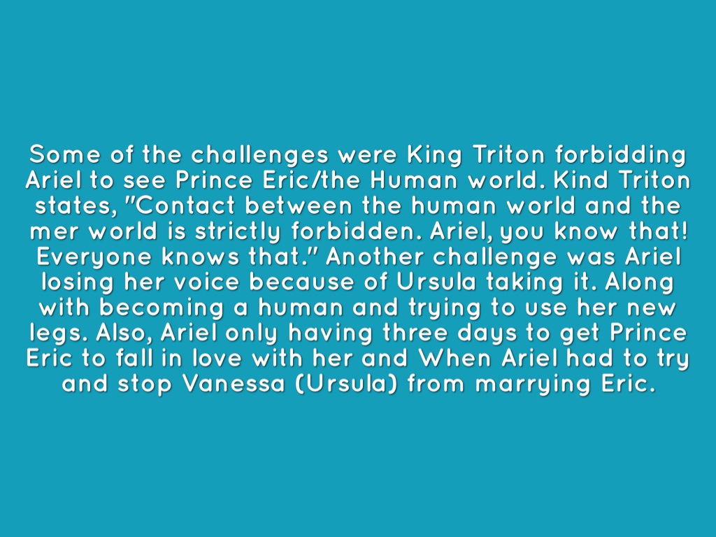 Some of the challenges were King Triton forbidding Ariel to see Prince Eric/the Human world. Kind Triton states, "Contact between the human world and the mer world is strictly forbidden. Ariel, you know that! Everyone knows that." Another challenge was Ariel losing her voice because of Ursula taking it. Along with becoming a human and trying to use her new legs. Also, Ariel only having three days to get Prince Eric to fall in love with her and When Ariel had to try and stop Vanessa (Ursula) from marrying Eric.