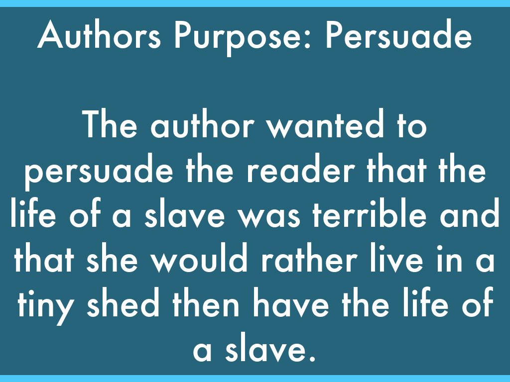 The author wanted to persuade the reader that the life of a slave was terrible and that she would rather live in a tiny shed then have the life of a slave.