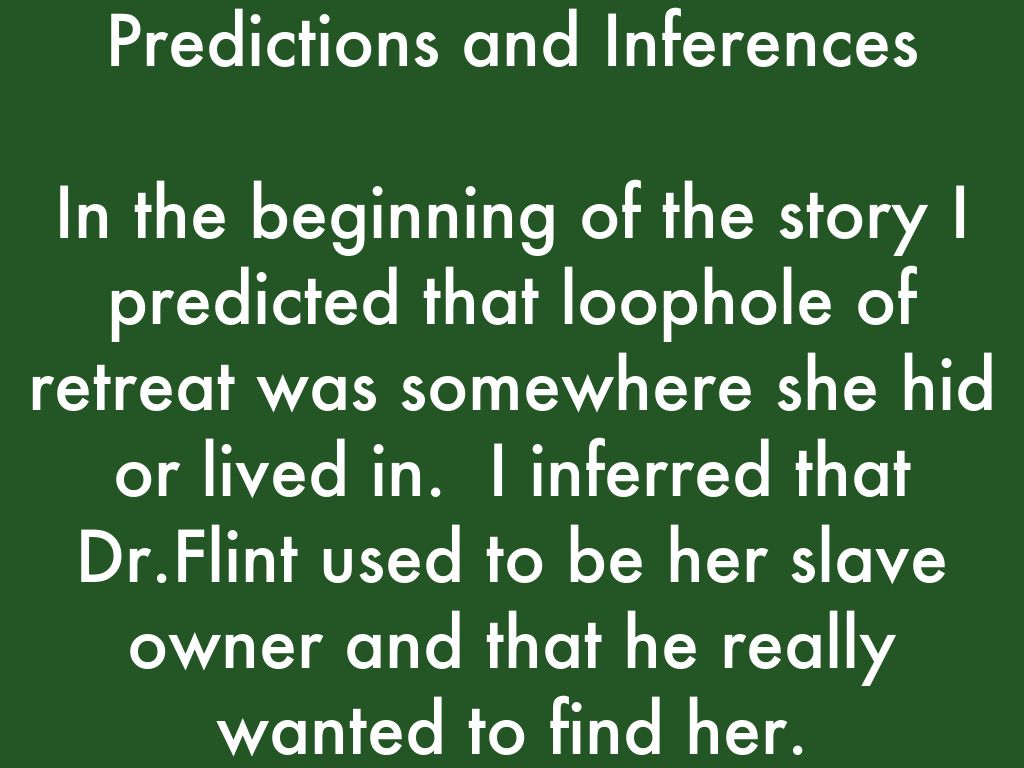 In the beginning of the story I predicted that loophole of retreat was somewhere she hid or lived in. I inferred that Dr.Flint used to be her slave owner and that he really wanted to find her.