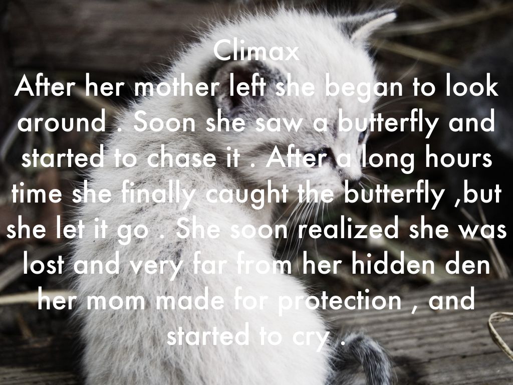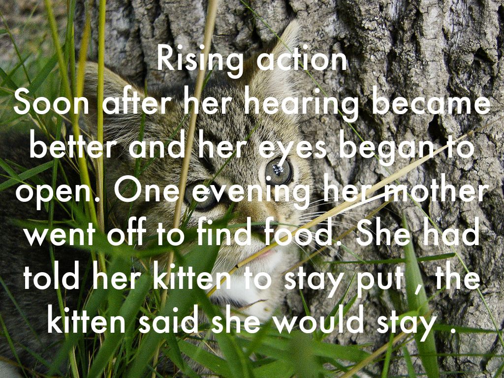 Rising action Soon after her hearing became better and her eyes began to open. One evening her mother went off to find food. She had told her kitten to stay put , the kitten said she would stay .