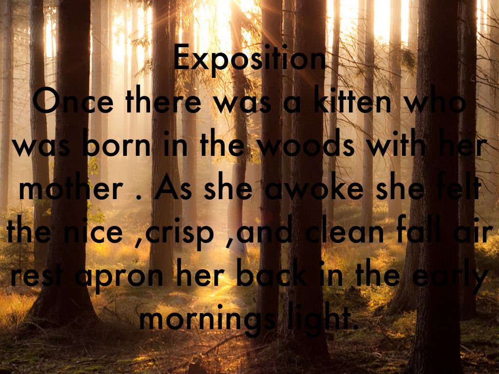 Exposition Once there was a kitten who was born in the woods with her mother . As she awoke she felt the nice ,crisp ,and clean fall air rest apron her back in the early mornings light.