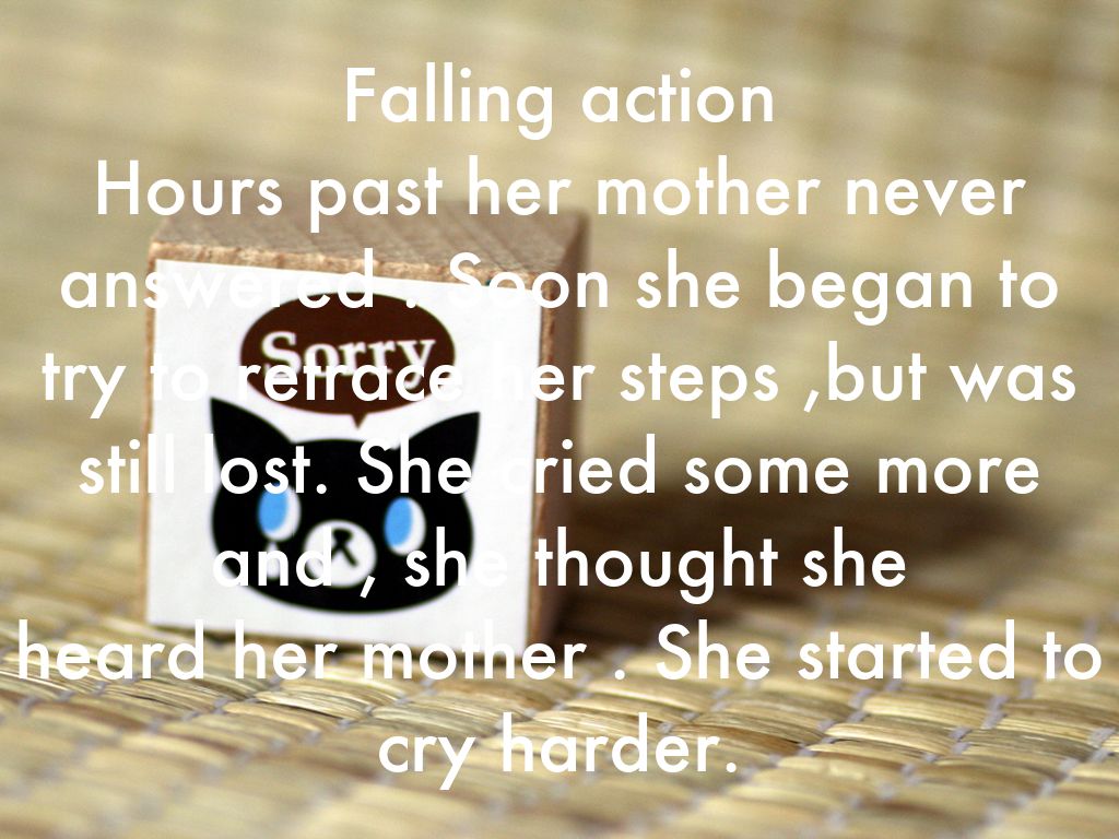 Falling action Hours past her mother never answered . Soon she began to try to retrace her steps ,but was still lost. She cried some more and , she thought she heard her mother . She started to cry harder.