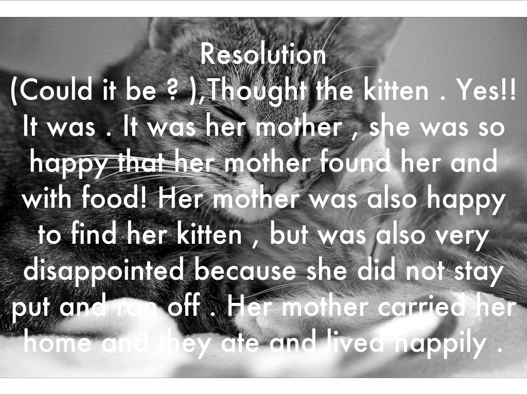 Resolution (Could it be ? ),Thought the kitten . Yes!! It was . It was her mother , she was so happy that her mother found her and with food! Her mother was also happy to find her kitten , but was also very disappointed because she did not stay put and ran off . Her mother carried her home and they ate and lived happily .
