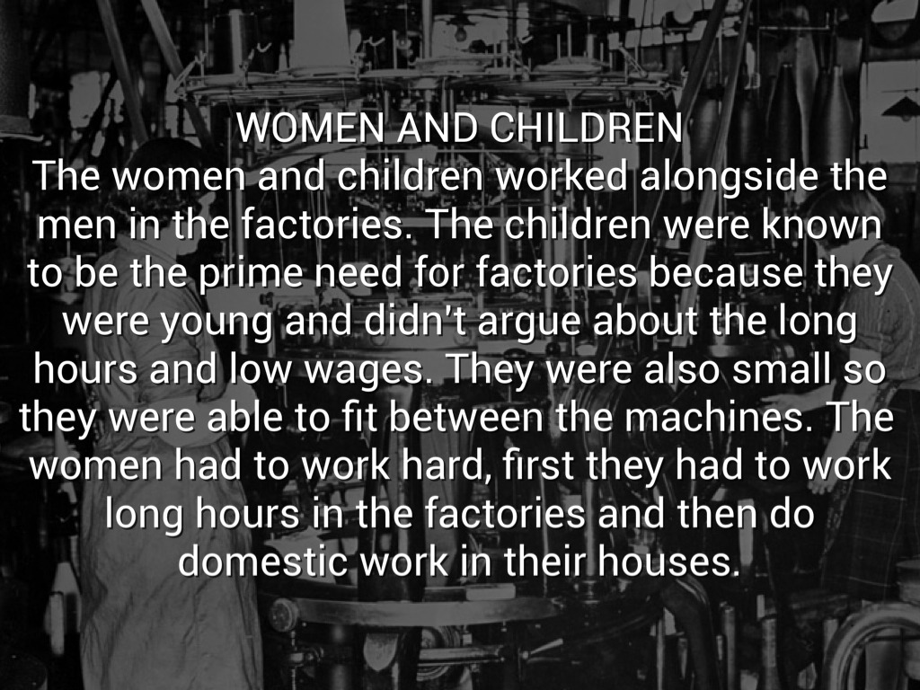 WOMEN AND CHILDREN The women and children worked alongside the men in the factories. The children were known to be the prime need for factories because they were young and didn't argue about the long hours and low wages. They were also small so they were able to fit between the machines. The women had to work hard, first they had to work long hours in the factories and then do domestic work in their houses.