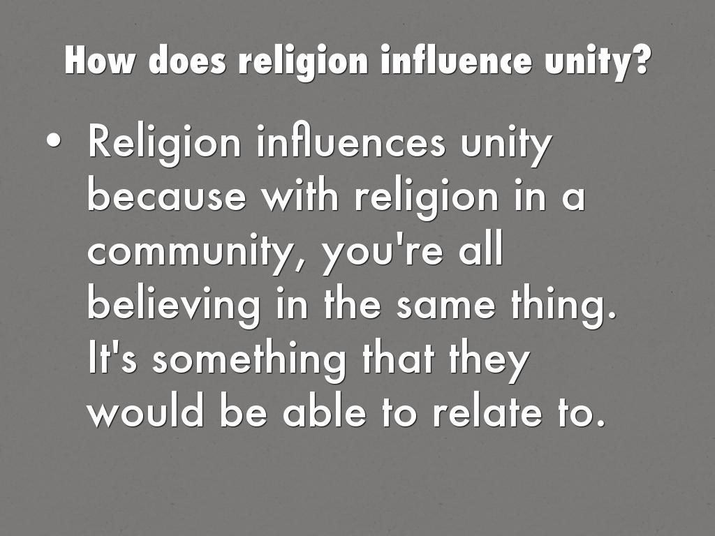 Religion influences unity because with religion in a community, you're all believing in the same thing. It's something that they would be able to relate to.