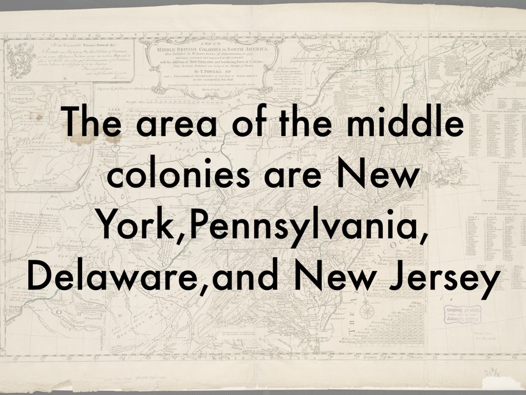 The area of the middle colonies are New York,Pennsylvania,