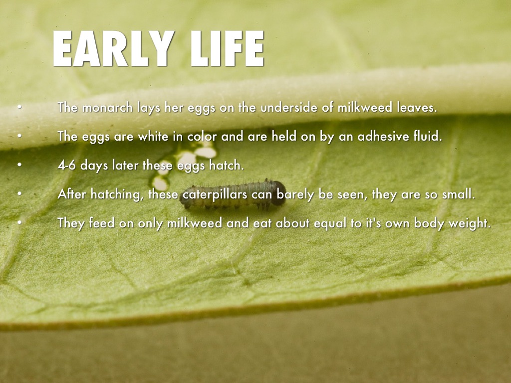 The monarch butterfly lays her eggs on the milkweed plant. Generally on the underside of the leaves. The eggs are white in color and 4-6 days after they are laid- they hatch.