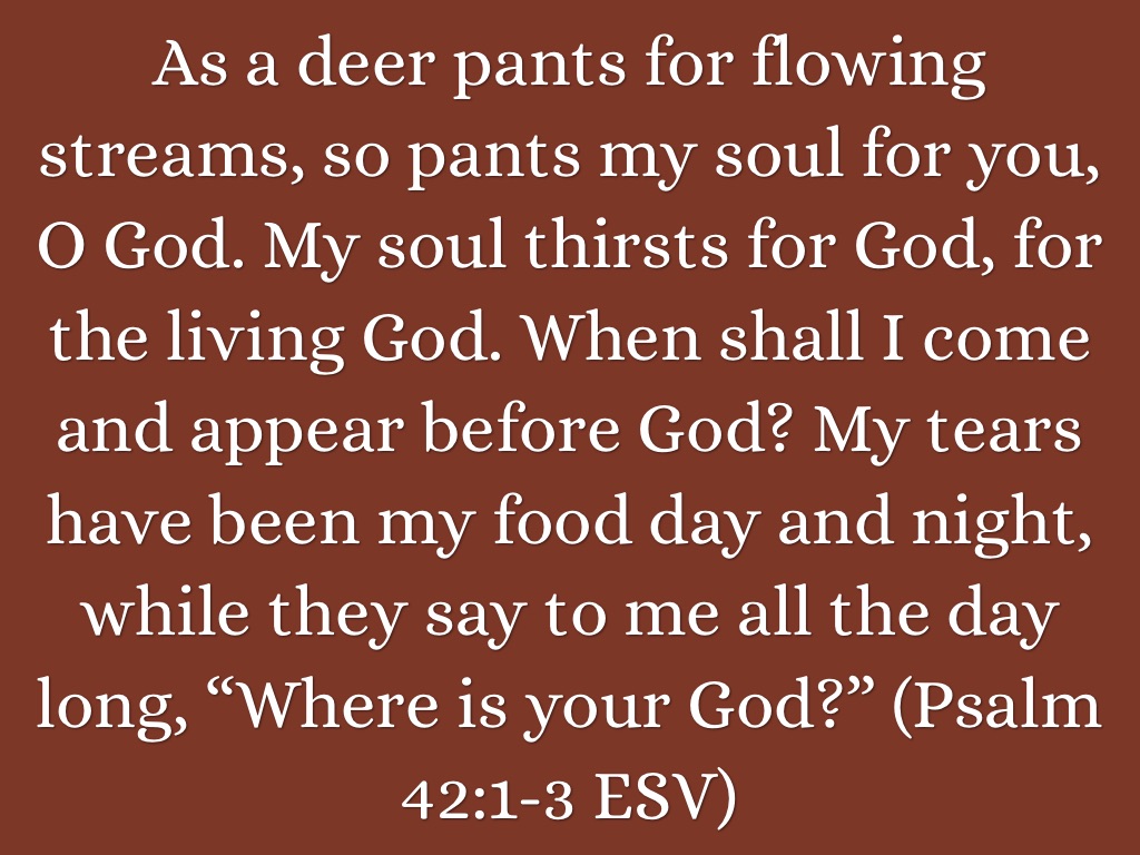 As a deer pants for flowing streams, so pants my soul for you, O God. My soul thirsts for God, for the living God. When shall I come and appear before God? My tears have been my food day and night, while they say to me all the day long, “Where is your God?” (Psalm 42:1-3 ESV)