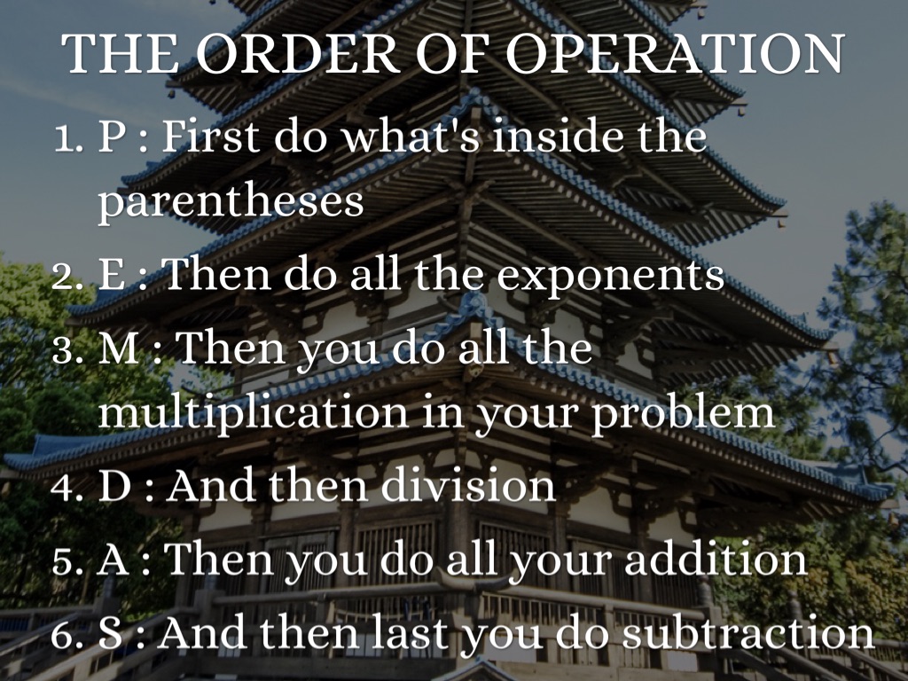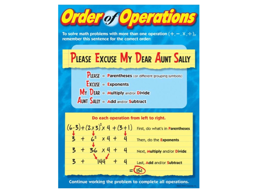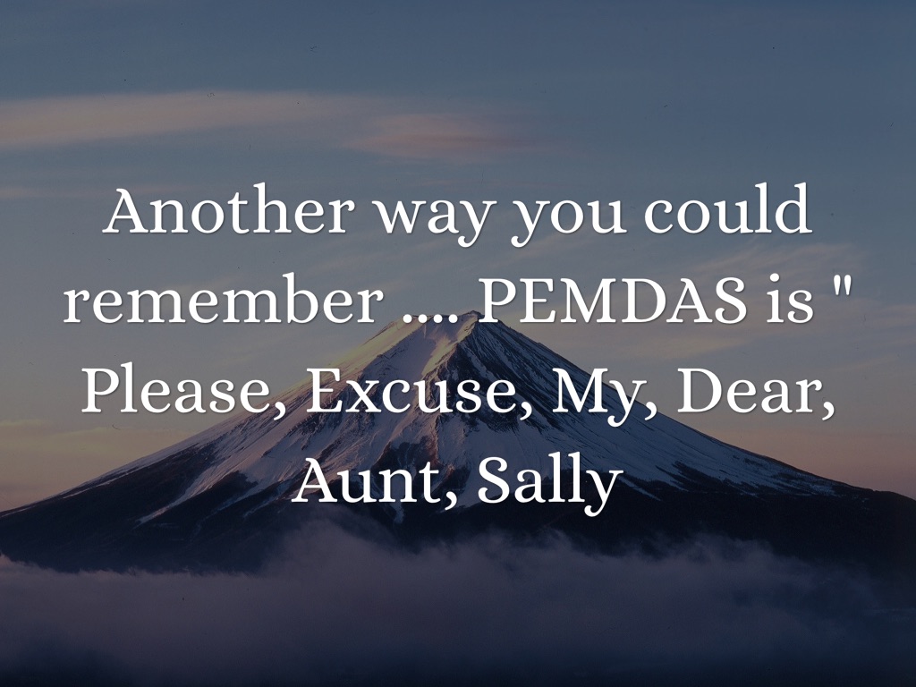 Another way you could remember .... PEMDAS is " Please, Excuse, My, Dear, Aunt, Sally