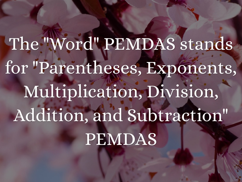 The "Word" PEMDAS stands for "Parentheses, Exponents, Multiplication, Division, Addition, and Subtraction" PEMDAS