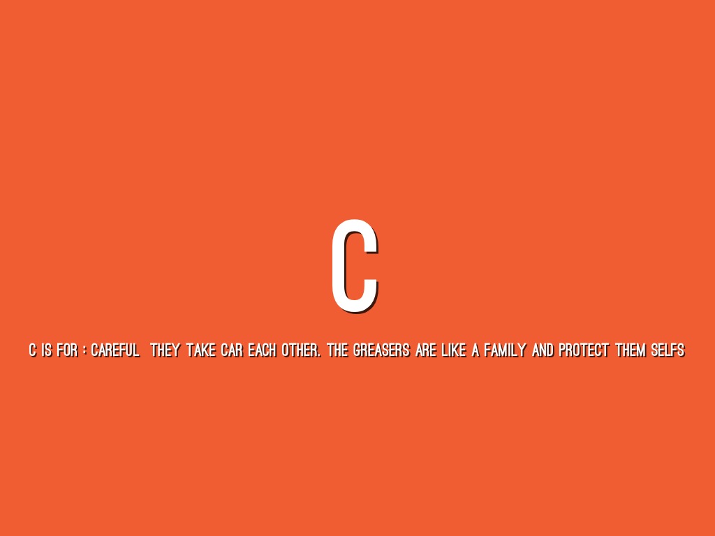 C IS FOR : CAREFUL THEY TAKE CAR EACH OTHER. THE GREASERS ARE LIKE A FAMILY AND PROTECT THEM SELFS