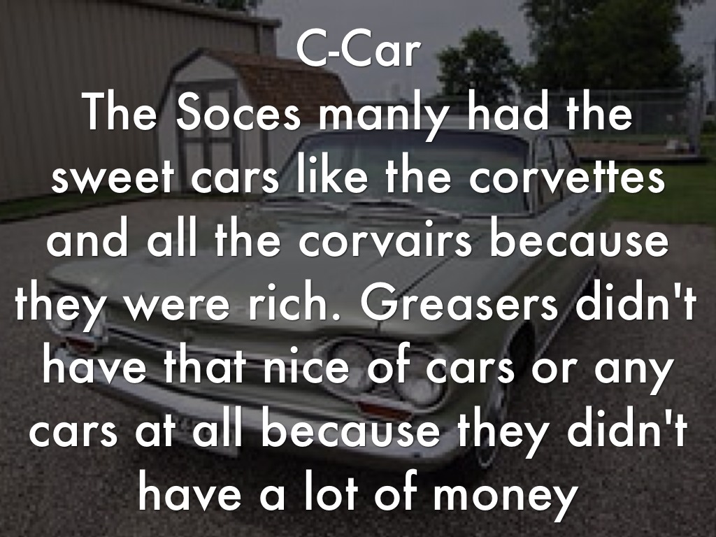 C-Car The Soces manly had the sweet cars like the corvettes and all the corvairs because they were rich. Greasers didn't have that nice of cars or any cars at all because they didn't have a lot of money