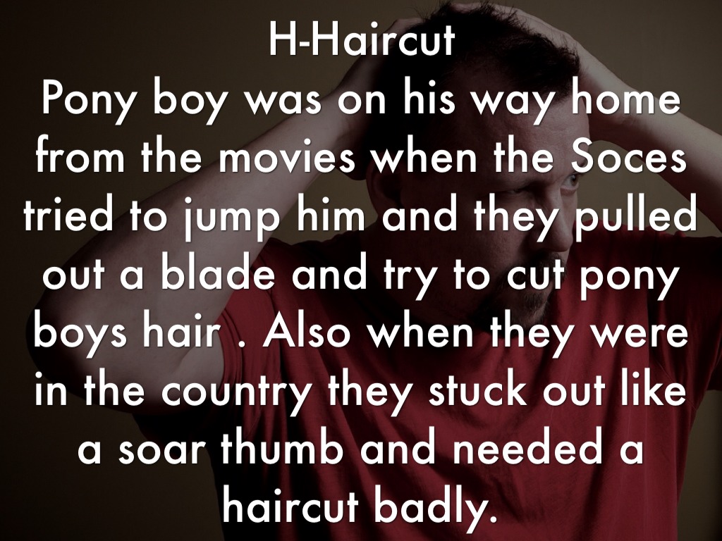 H-Haircut Pony boy was on his way home from the movies when the Soces tried to jump him and they pulled out a blade and try to cut pony boys hair . Also when they were in the country they stuck out like a soar thumb and needed a haircut badly.