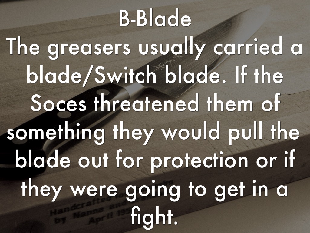 B-Blade The greasers usually carried a blade/Switch blade. If the Soces threatened them of something they would pull the blade out for protection or if they were going to get in a fight.