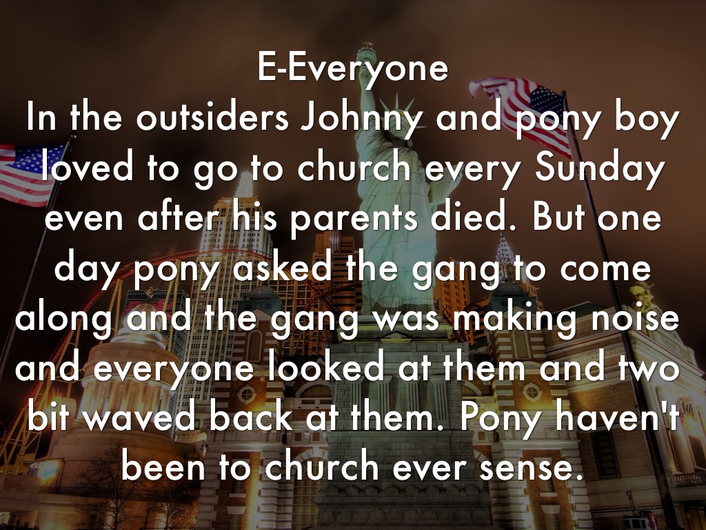 E-Everyone In the outsiders Johnny and pony boy loved to go to church every Sunday even after his parents died. But one day pony asked the gang to come along and the gang was making noise and everyone looked at them and two bit waved back at them. Pony haven't been to church ever sense.