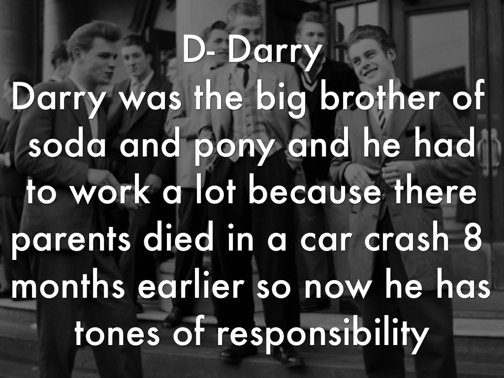 D- Darry Darry was the big brother of soda and pony and he had to work a lot because there parents died in a car crash 8 months earlier so now he has tones of responsibility