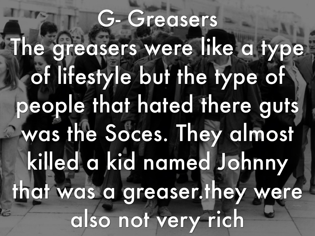 G- Greasers The greasers were like a type of lifestyle but the type of people that hated there guts was the Soces. They almost killed a kid named Johnny that was a greaser.they were also not very rich