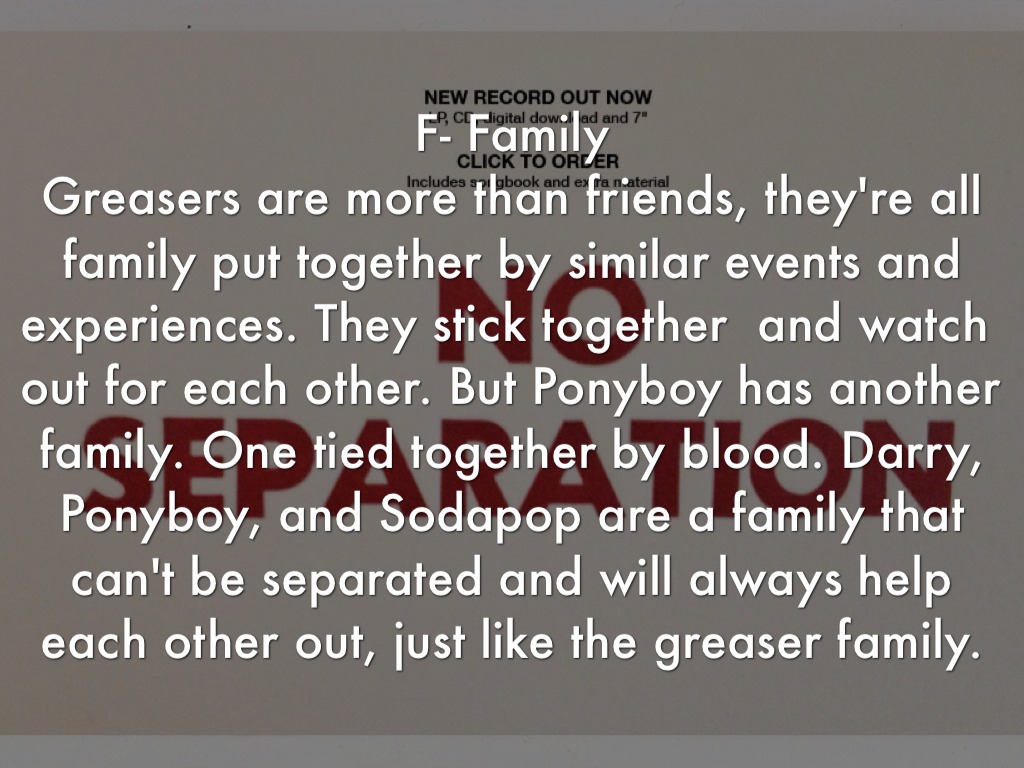 Greasers are more than friends, they're all family put together by similar events and experiences. They stick together and watch out for each other. But Ponyboy has another family. One tied together by blood. Darry, Ponyboy, and Sodapop are a family that can't be separated and will always help each other out, just like the greaser family.