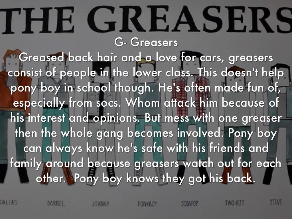 Greased back hair and a love for cars, greasers consist of people in the lower class. This doesn't help pony boy in school though. He's often made fun of, especially from socs. Whom attack him because of his interest and opinions. But mess with one greaser then the whole gang becomes involved. Pony boy can always know he's safe with his friends and family around because greasers watch out for each other. Pony boy knows they got his back.