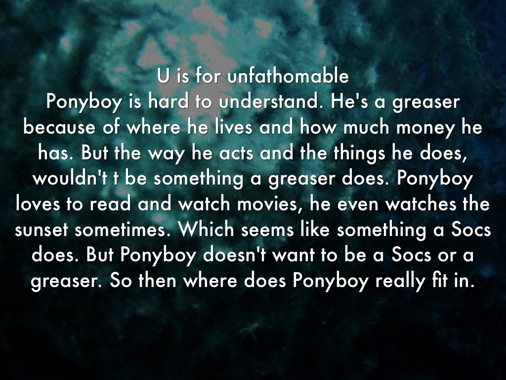 U is for unfathomable Ponyboy is hard to understand. He's a greaser because of where he lives and how much money he has. But the way he acts and the things he does, wouldn't t be something a greaser does. Ponyboy loves to read and watch movies, he even watches the sunset sometimes. Which seems like something a Socs does. But Ponyboy doesn't want to be a Socs or a greaser. So then where does Ponyboy really fit in.