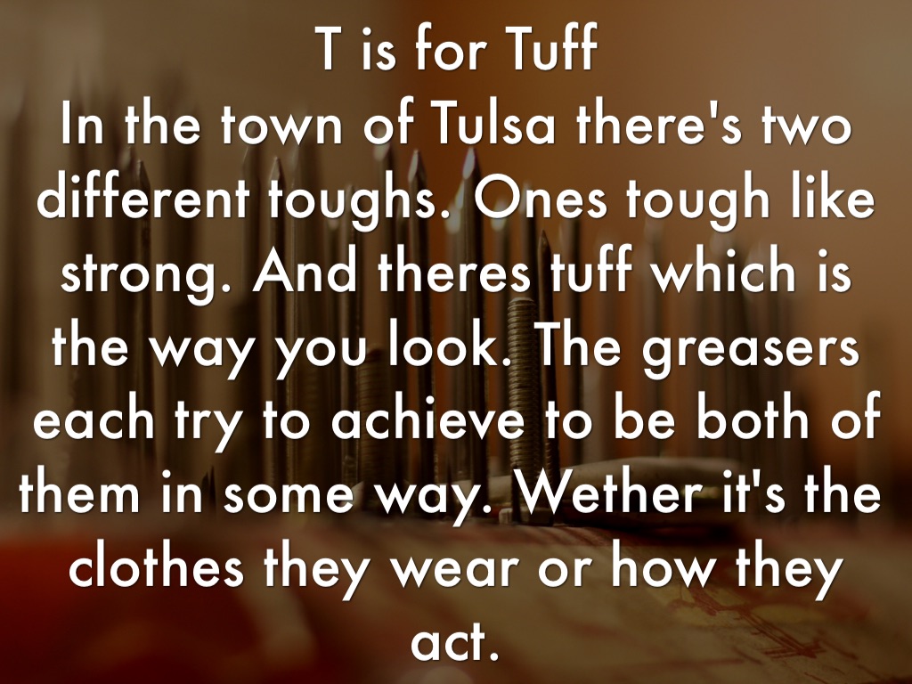 T is for Tuff In the town of Tulsa there's two different toughs. Ones tough like strong. And theres tuff which is the way you look. The greasers each try to achieve to be both of them in some way. Wether it's the clothes they wear or how they act.