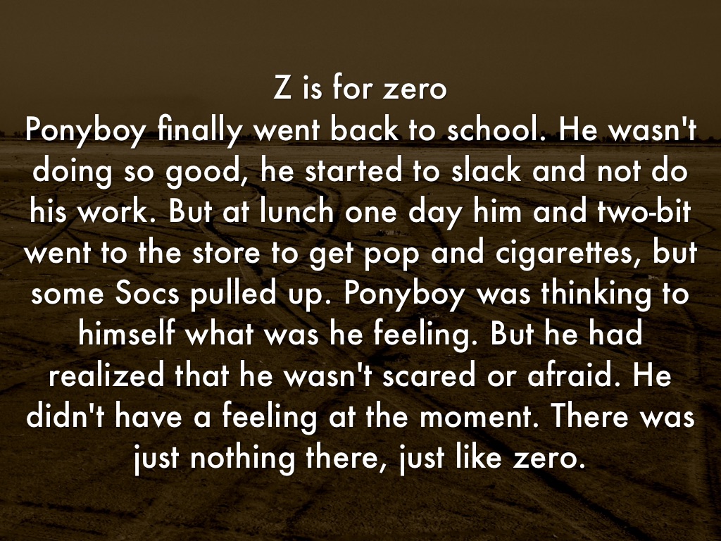 Z is for zero Ponyboy finally went back to school. He wasn't doing so good, he started to slack and not do his work. But at lunch one day him and two-bit went to the store to get pop and cigarettes, but some Socs pulled up. Ponyboy was thinking to himself what was he feeling. But he had realized that he wasn't scared or afraid. He didn't have a feeling at the moment. There was just nothing there, just like zero.