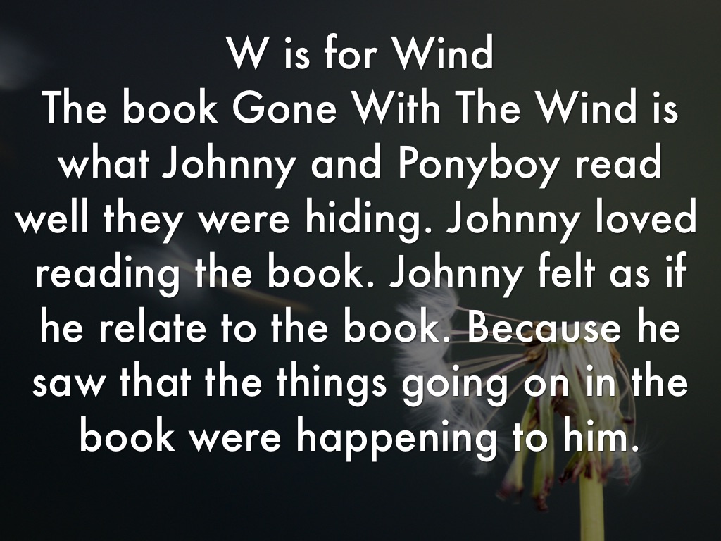 W is for Wind The book Gone With The Wind is what Johnny and Ponyboy read well they were hiding. Johnny loved reading the book. Johnny felt as if he relate to the book. Because he saw that the things going on in the book were happening to him.