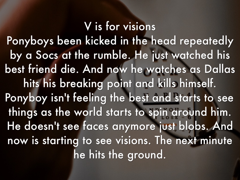 V is for visions Ponyboys been kicked in the head repeatedly by a Socs at the rumble. He just watched his best friend die. And now he watches as Dallas hits his breaking point and kills himself. Ponyboy isn't feeling the best and starts to see things as the world starts to spin around him. He doesn't see faces anymore just blobs. And now is starting to see visions. The next minute he hits the ground.