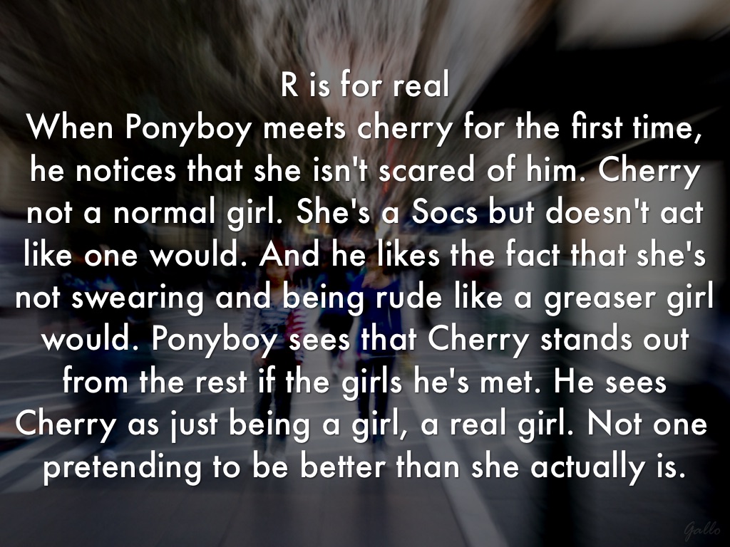R is for real When Ponyboy meets cherry for the first time, he notices that she isn't scared of him. Cherry not a normal girl. She's a Socs but doesn't act like one would. And he likes the fact that she's not swearing and being rude like a greaser girl would. Ponyboy sees that Cherry stands out from the rest if the girls he's met. He sees Cherry as just being a girl, a real girl. Not one pretending to be better than she actually is.
