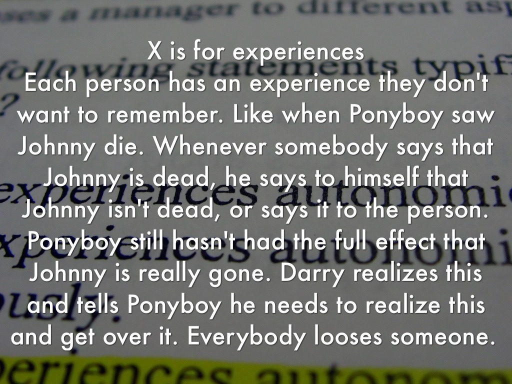 X is for experiences Each person has an experience they don't want to remember. Like when Ponyboy saw Johnny die. Whenever somebody says that Johnny is dead, he says to himself that Johnny isn't dead, or says it to the person. Ponyboy still hasn't had the full effect that Johnny is really gone. Darry realizes this and tells Ponyboy he needs to realize this and get over it. Everybody looses someone.