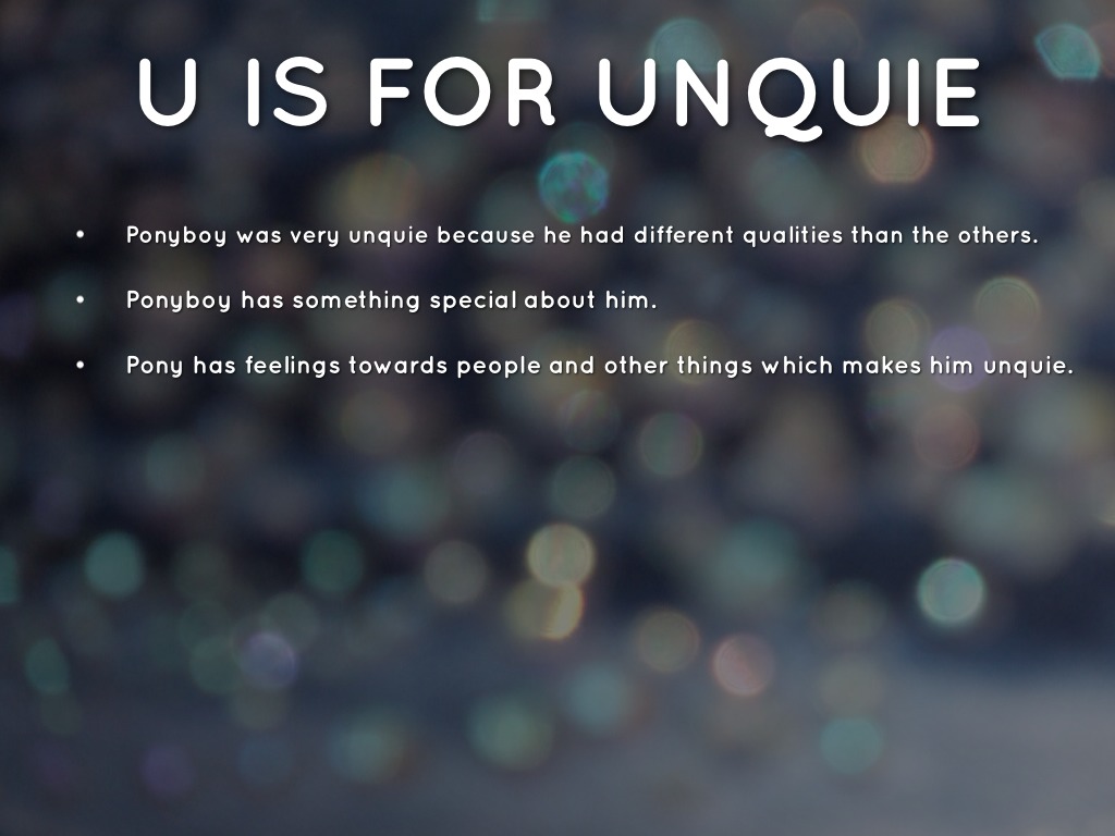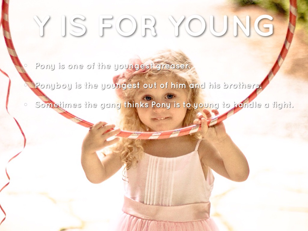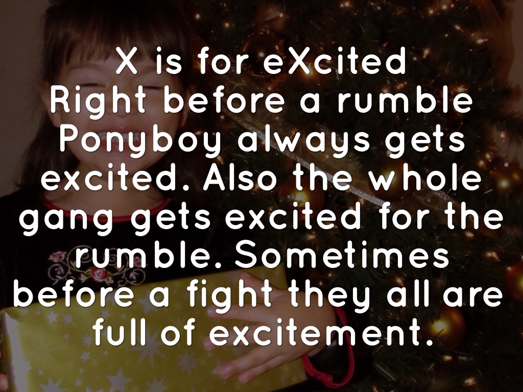 X is for eXcited Right before a rumble Ponyboy always gets excited. Also the whole gang gets excited for the rumble. Sometimes before a fight they all are full of excitement.